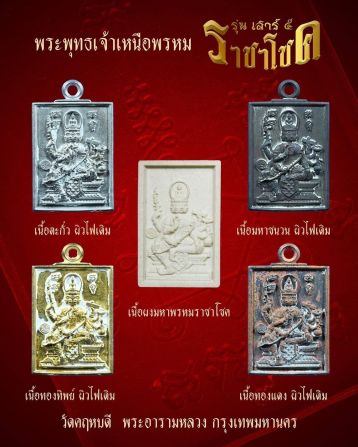 (๒) เหรียญพระพุทธเจ้าเหนือพรหม รุ่นเสาร์ ๕ ราชาโชค สร้าง 5 เนื้อ คือ เนื้อตะกั่ว ผิวไฟเดิม, เนื้อมหาชนวน ผิวไฟเดิม, เนื้อผงมหาพรหมราชาโชค, เนื้อทองทิพย์ ผิวไฟเดิม และ เนื้อทองแดง ผิวไฟเดิม พระพุทธเจ้าเหนือพรหม หลวงปู่ดู่วัดสะแกได้จัดสร้างไว้เป็นที่นิยมและหายากแล้ว หลวงปู่ดู่ ยกพระพุทธตำนานในบทสวดพระคาถาพาหุงบทหนึ่งเป็นเรื่องที่พระพุทธเจ้าทรงเอาชนะ ผกาพรหม ผู้มีทิฏฐิแรงกล้าสำคัญว่าตนเองเป็นผู้ที่มีความสำคัญที่สุด พระพุทธเจ้าทำให้ยอมละทิ้งทิฏฐิมานะและยอมว่าพระพุทธเจ้าสูงกว่าถือเป็นบทที่ใช้เอาชนะทิฏฐิมานะของคน จึงมีพุทธคุณด้านเป็นที่รักและเมตตามหาลาภเป็นเลิศ