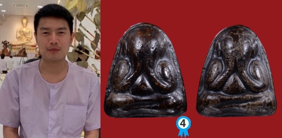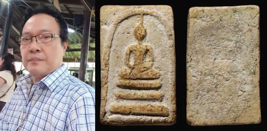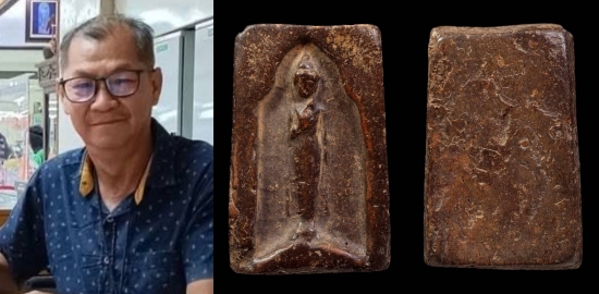พระท่ากระดานพิมพ์เล็ก เนื้อตะกั่วสนิมแดง กรุศรีสวัสดิ์ จังหวัดกาญจนบุรี พระท่ากระดานจัดเป็นพระกรุยอดนิยม พระยอดขุนพลค้นพบที่เมืองท่ากระดานเมืองเก่าแก่เมืองเดียวริมแม่น้ำแควใหญ่ เป็นเมืองสำคัญในสมัยอยุธยาเคียงคู่กับเมืองกาญจนบุรี เป็นเมืองหน้าด่านการสู้รบกับกองทัพพม่า บริเวณด่านพระเจดีย์สามองค์ ในปี พ.ศ.2495 มีการขุดค้นหาวัตถุโบราณพบพระท่ากระดานตะกั่วสนิมแดง ที่วัดท่ากระดานจึงเรียกชื่อพระตามชื่อสถานที่พบพระ ว่าพระท่ากระดาน พุทธคุณจากประสบการณ์ของผู้ใช้เล่าว่าเป็นเลิศด้านแคล้วคลาด และคงกระพันชาตรี ได้รับการยกย่องกล่าวขานให้เป็น “ขุนศึกแห่งลุ่มน้ำแม่กลอง” พระท่ากระดานพิมพ์เล็ก กรุศรีสวัสดิ์องค์นี้ของ คุณวิชัย ไพรรื่นรมย์