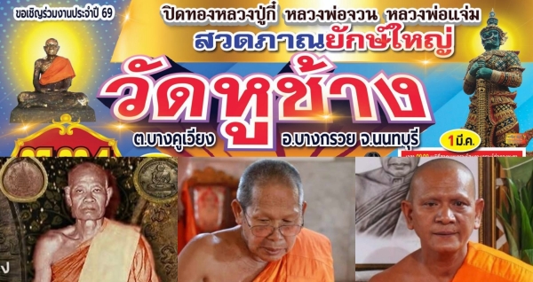 ♦♦♦ “งานปีวัดหูช้าง ๖๙” พิธีใหญ่ไล่ผี สวดพานยักษ์ใหญ่กลางลานวัดหูช้าง อ.บางกรวย จ.นนทบุรี ทำกันมาแต่สมัยหลวงปู่กี๋ พระครูกิตตินนทคุณ พระหมออาคมเข้มขลังโด่งดังด้วยน้ำมนต์รักษาโรคเสกเป่าเป็นหมอบุญเทวดาและเสกปลัดขิก ยังคงสืบทอดต่อมาถึงปัจจุบัน ท่ามกลางผู้คนแน่นขนัดเหมือนวัดแตก ผู้คนแห่แหนกันมาจองที่นั่งฟังการสวดภาณยักษ์ใหญ่ไล่ภูตผี ปีศาจ คุณไสย มนต์ดำ ลมเพลมพัด ผีเข้าเจ้าทรง รวมไปถึงโรคภัยไข้เจ็บและยังเสริมช่วยปีชงคนดวงตกเป็นสิริมงคลแก่ผู้ร่วมพิธี เป็นพิธีกรรมที่มีมาแต่โบราณ