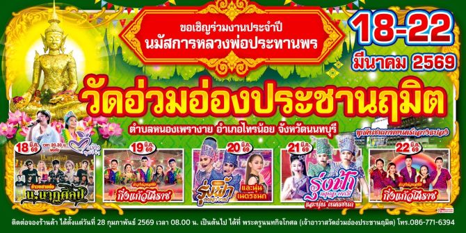 ♦♦♦ “หลวงพ่อช้าง” พระครูนนทกิจโกศล เจ้าคณะอำเภอไทรน้อย เจ้าอาวาสวัดอ่วมอ่องประชานฤมิต ต.หนองเพรางาย อ.ไทรน้อย จ.นนทบุรี ศิษย์สืบสายวิชาอาคมวัดสะพานสูง จากหลวงปู่วาส อดีตเจ้าอาวาสวัดสะพานสูงผู้สืบทอดวิชาอาคมสายตรงหลวงปู่เอี่ยมวัดสะพานสูง หลวงพ่อช้างจึงเป็นหนึ่งในพระคณาจารย์ที่มีวิชาอาคมของ อ.ไทรน้อย จ.นนทบุรี ประกาศ “จัดงานประจำปี ๒๕๖๙” วันที่ ๑๘-๑๙- ๒๐-๒๑-๒๒ มีนาคม ๒๕๖๙ ปิดทองหลวงพ่อประทานพร พระศักดิ์สิทธิ์เป็นที่ศรัทธาของชาวบ้านและฉลองศาลาทรงไทยเอนกประสงค์สร้างใหม่แทนศาลาการเปรียญหลังเก่าที่ชำรุดทรุดโทรมตามกาลเวลา ญาติโยมได้ใช้ประกอบศาสนกิจทางพระศาสนา วัดได้ใช้เป็นเรือนรับรองพระเถระ งานเริ่มวันพุธที่ 18 มีนาคมนี้แล้ว จึงขอเชิญเที่ยวงานประจำปี วัดอ่วมอ่องประชานฤมิต นำรายได้ซื้อที่ดินถวายวัดตามความศรัทธาและความเชื่อของชาวพุทธที่สืบเนื่องกันมานับร้อยนับพันปี เพื่อสืบสานพระศาสนาในประเทศไทยอย่างถาวรและมั่นคง