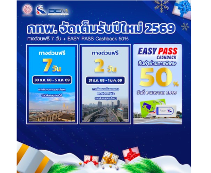 ดีเดย์ 6 ม.ค.69 กทพ. เตรียมมอบของขวัญต้อนรับปีใหม่ กับแคมเปญ “EASY PASS…Cashback” คืนค่าผ่านทาง 50%