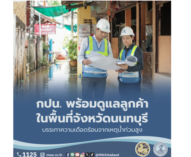 กปน. ขอส่งความห่วงใยไปยังผู้ประสบภัย และพร้อมให้ความช่วยเหลือผู้ได้รับผลกระทบจากอุทกภัยอย่างเต็มกำลัง ภายใต้นโยบาย “บำบัดทุกข์ บำรุงสุข” ของกระทรวงมหาดไทย เพื่อบรรเทาความเดือดร้อนและให้ประชาชนสามารถกลับมาใช้ชีวิตได้ตามปกติโดยเร็ว พร้อมยืนยันว่า น้ำประปาของ กปน. ยังคงสะอาด ปลอดภัย และผ่านการตรวจสอบคุณภาพอย่างสม่ำเสมอ โดยเฉพาะในพื้นที่ประสบอุทกภัย ทั้งนี้ หากต้องการแจ้งเหตุขัดข้อง สามารถติดต่อได้ที่ MWA Call Center โทร. 1125 ตลอด 24 ชั่วโมง