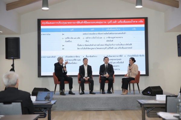 ดร.นพ.บัณฑิต ศรไพศาล นักวิจัย Center for Addiction and Mental Health ประเทศแคนาดา สรุปชุดข้อเสนอเชิงนโยบายที่ เสนอให้มีการปรับปรุงภาษีสินค้ าที่มีผลกระทบต่อสุขภาพสี่ชนิด ด้วยเหตุผลคือ โรค NCDs ก่อให้เกิดผลกระทบอย่างมากต่ อประชากรไทยและเศรษฐกิ จของประเทศ สาเหตุสำคัยคือพฤติกรรมการบริ โภคสินค้าที่มีผลต่อสุขภาพ คือ บุหรี่ เหล้า เครื่องดื่มผสมน้ำตาล และ เกลือ ซึ่งเป็นสินค้าที่รัฐควรใช้ มาตรการทางภาษีมาเพื่อควบคุ มการบริโภค ซึ่งประโยชน์อีกทางคือการได้ รายได้ภาษีเข้ารัฐ ข้อเสนอมาตรการภาษีร่วมทุกสิ นค้า คือ (1) การลดช่องว่างของอัตราภาษีระหว่ างผลิตภัณฑ์ย่อยๆ ของแต่ละสินค้า (2) การกำหนดขึ้นอัตราภาษีแต่ละสิ นค้าอย่างสม่ำเสมอหรือผูกโยงกั บภาวะเงินเฟ้อแบบอัตโนมัติ และ (3) จัดการกับสินค้าผิดกฎหมาย โดยเฉพาะอย่างยิ่งบุหรี่ บุหรี่ไฟฟ้า และเครื่องดื่มแอลกอฮอล์ ส่วนข้อเสนอเฉพาะสินค้า ได้แก่ สำหรับบุหรี่ ควรปรับลดอัตราภาษียาสู บประเภทบุหรี่จากสองอัตราเป็นอั ตราเดียว สำหรับเครื่องดื่มผสมน้ำตาล ควรดำเนินมาตรการภาษีให้ครอบคลุ มนมปรุงแต่ง น้ำผลไม้ เครื่องดื่มที่มีส่ วนผสมของสารทดแทนความหวาน สำหรับเครื่องดื่มแอลกอฮอล์ ควรปรับเพิ่มภาษีสุราขาวซึ่งมี อัตราภาษีที่ต่ำมาก และ สำหรับสินค้าที่ใส่เกลือโซเดียม ควรเริ่มต้นกำหนดให้มีการจัดเก็ บภาษีตามปริมาณโซเดียมในผลิตภั ณฑ์ เช่น ขนมขบเคี้ยวและบะหมี่กึ่งสำเร็ จรูป