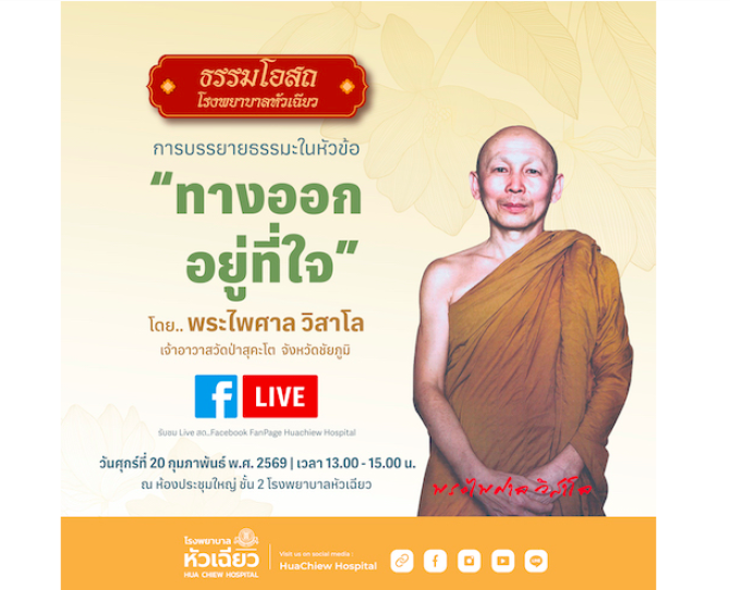 โรงพยาบาลหัวเฉียวขอเชิญพุทธศาสนิกชนและผู้สนใจร่วมโครงการธรรมโอสถ โดยได้รับเมตตาจากพระไพศาล วิสาโล เจ้าอาวาสวัดป่าสุคะโต จังหวัดชัยภูมิ มาเป็นองค์บรรยายธรรมในหัวข้อ “ทางออกอยู่ที่ใจ”เพื่อชี้แนะแนวทางการขัดเกลาจิตใจให้บริสุทธิ์ผ่องใส และการสร้างความสุขอย่างยั่งยืนจากภายในพร้อมรับมือกับปัญหาต่างๆ ด้วยสติ