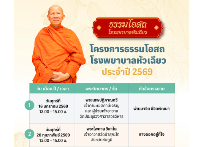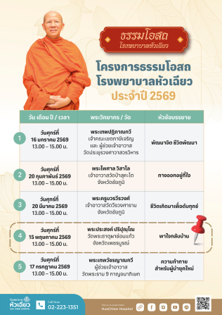 พบกันวันศุกร์ที่ 15 พฤษภาคม 2569 เวลา 13.00 – 15.00 น. ณ ห้องประชุมใหญ่ ชั้น 2 อาคาร 1 โรงพยาบาลหัวเฉียว เข้าร่วมฟังการบรรยายโดยไม่มีค่าใช้จ่าย ติดต่อสำรองที่นั่ง โทร. 0-2223-1351 ต่อ 3126