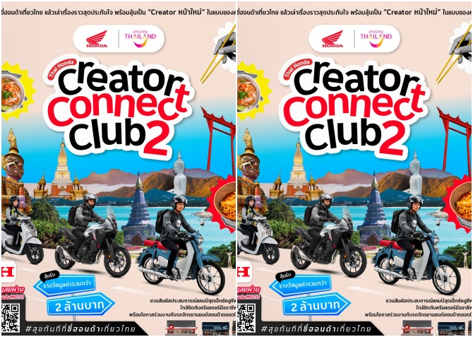 รถจักรยานยนต์ฮอนด้า ร่วมกับ การท่องเที่ยวแห่งประเทศไทย (ททท.) เปิดตัวแคมเปญ “Thai Honda Creator Connect Club 2 : สุขทันทีที่ขี่ฮอนด้าเที่ยวไทย” กลับมาอีกครั้งอย่างยิ่งใหญ่และพิเศษกว่าเดิม ภายใต้แนวคิด “สุขทันที...ที่ขี่ฮอนด้าเที่ยวไทย” ชวนเหล่าครีเอเตอร์ทั่วประเทศร่วมออกเดินทางท่องเที่ยวเมืองไทย ถ่ายทอดเรื่องราวผ่านคอนเทนต์แนะนำ “สถานที่สุดประทับใจ ที่ทั้งชิคและคูลจนอยากแชร์” ในสไตล์ของตนเอง โดยใช้รถจักรยานยนต์ฮอนด้าเป็นเพื่อนคู่ใจในการเดินทางผู้เข้าร่วมกิจกรรมสามารถรับสิทธิ์ E-Voucher จากโลตัส มูลค่า 300 บาท (สำหรับผู้ที่ใช้รถจักรยานยนต์ฮอนด้าขนาดเล็กต่ำกว่า 400 ซีซี ในการทำคอนเทนต์) และ 500 บาท (สำหรับผู้ที่ใช้รถจักรยานยนต์ฮอนด้า CUB House หรือ Big Bike ในการทำคอนเทนต์) จำนวนจำกัด 1,000 สิทธิ์ พร้อมลุ้นเข้ารอบ 20 คนสุดท้ายร่วมทริปสุดเอ็กซ์คลูซีฟกับทางรถจักรยานยนต์ฮอนด้า และ ททท. โดยผู้ที่ชนะจะได้รับ All New Honda Scoopy รุ่น Club12 พร้อมเงินรางวัลมูลค่าสูงสุด 50,000 บาท และ Gift Voucher สำหรับท่องเที่ยวในไทยมูลค่า 25,000 บาท รวมรางวัลทั้งแคมเปญมูลค่ากว่า 2,000,000 บาท