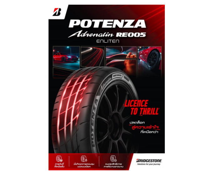บริษัท บริดจสโตนเซลส์ (ประเทศไทย) จำกัด เปิดตัวผลิตภัณฑ์ยางรถยนต์สปอร์ตพรีเมียมรุ่นใหม่ล่าสุด “BRIDGESTONE POTENZA Adrenalin RE005” ภายใต้คอนเซปต์ “ปลดล็อกสู่ความเร้าใจที่เหนือกว่า” พร้อมให้คุณปลดปล่อยพลังความสปอร์ตเต็มพิกัด ควบคุมแม่นยำ และมั่นใจทุกการควบคุม BRIDGESTONE POTENZA Adrenalin RE005 มาพร้อมกับเทคโนโลยี ENLITENTM ของบริดจสโตน ยกระดับสมรรถนะการขับขี่อย่างเหนือชั้น คงประสิทธิภาพการใช้งานยาวนาน ทั้งยังเป็นมิตรต่อสิ่งแวดล้อม ผสานความสปอร์ตเร้าใจเข้ากับความยั่งยืนอย่างลงตัว ยางรถยนต์สปอร์ตพรีเมียมรุ่นนี้เหมาะสำหรับรถยนต์หลายประเภท เช่น รถสปอร์ต รถยนต์สมรรถนะสูง และรถยนต์ไฟฟ้า