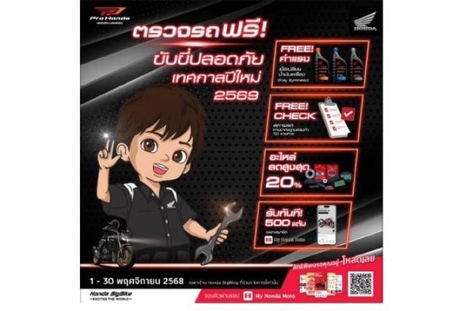 ฮอนด้าบิ๊กไบค์ ชวนผู้ใช้รถจักรยานยนต์ฮอนด้าบิ๊กไบค์ทุกรุ่น เข้ารับบริการตรวจรถฟรีกับกิจกรรม“ตรวจรถฟรี ขับขี่ปลอดภัย เทศกาลปีใหม่ 2569” เพื่อความปลอดภัยบนท้องถนน และสร้างความมั่นใจให้ผู้ใช้รถจักรยานยนต์ฮอนด้าก่อนออกเดินทางในช่วงเทศกาลปีใหม่ 2569 พร้อมรับสิทธิพิเศษอื่น ๆ ได้ที่ Honda BigWing ทั่วประเทศ (เฉพาะร้านที่ร่วมรายการ) ตั้งแต่วันที่ 1 – 30 พฤศจิกายน 2569