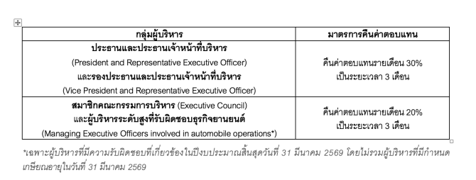นอกจากนี้ ฮอนด้า ยังตัดสินใจให้ประธานและประธานเจ้าหน้าที่บริหาร รวมถึงรองประธานและประธานเจ้าหน้าที่บริหาร งดรับค่าตอบแทนตามผลงานระยะสั้น (Short‑Term Incentive: STI) สำหรับปีงบประมาณสิ้นสุดวันที่31 มีนาคม 2569 จากมาตรการดังกล่าว ส่งผลให้ ค่าตอบแทนรวมรายปีของผู้บริหารระดับสูงลดลงประมาณ