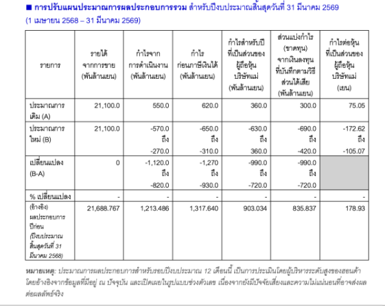 ผลประกอบการรวมสำหรับปีงบประมาณสิ้นสุดวันที่ 31 มีนาคม 2569 บริษัทฯ ได้ตัดสินใจไม่ปรับเปลี่ยน