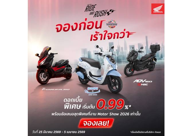 รถจักรยานยนต์ฮอนด้า มอบโปรฯ เดือด “RIDE AND RUSH จองก่อนเร้าใจกว่า” จัดเต็มดอกเบี้ยพิเศษและข้อเสนอสุดคุ้มในงาน Motor Show 2026 เท่านั้น