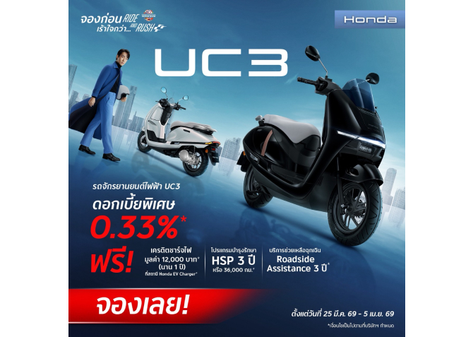 ผู้ที่สนใจสามารถเข้าชมและจอง New Honda UC3 ได้ที่บูทฮอนด้า (M1 และ A22) ในงานบางกอก อินเตอร์เนชั่นแนล มอเตอร์โชว์ ครั้งที่ 47 (The 47th Bangkok International Motor Show) ณ อาคารชาเลนเจอร์ฮอลล์ 1 อิมแพ็ค เมืองทองธานี พร้อมเปิดโอกาสให้สัมผัสรถพลังงานไฟฟ้าอย่างใกล้ชิด และสามารถจองได้ที่ศูนย์บริการ Wing Center ทุกสาขา และผ่านช่องทางออนไลน์ได้ที่ https://bit.ly/4dHJfpK โดยข้อเสนอนี้เฉพาะวันที่ 25 มีนาคม 2569 – 5 เมษายน 2569 เท่านั้น*