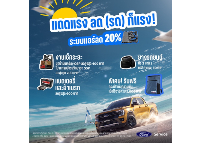 ฟอร์ด ประเทศไทย มอบความมั่นใจและความปลอดภัยในช่วงเทศกาลวันหยุดฤดูร้อนที่ลูกค้ารถฟอร์ดต้องเดินทางไกล จัดแคมเปญบริการหลังการขายสุดพิเศษ ‘แดดแรง ลด(รถ) ก็แรง’ ชวนลูกค้านำรถเข้าตรวจสภาพให้พร้อมสู้ลมร้อน ด้วยข้อเสนอสุดคุ้ม อาทิ ส่วนลดอะไหล่ระบบแอร์ 20% ส่วนลดแพ็กเกจเช็กระยะสูงสุด 700 บาท โปรโมชันยาง 3 แถม 1 และรับฟรี กระเป๋าเก็บความเย็น ตั้งแต่วันที่ 1 มีนาคม – 30 มิถุนายน 2569 ที่ศูนย์บริการฟอร์ดทั่วประเทศ