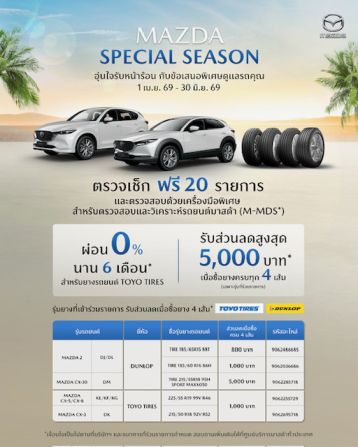 ครั้งนี้ มาสด้าจึงได้จัดแคมเปญ “MAZDA SPECIAL SEASON อุ่นใจรับหน้าร้อน กับข้อเสนอพิเศษดูแลรถคุณ” ชวนลูกค้ามาสด้า นำรถเข้ารับบริการตรวจเช็กฟรี 20 รายการ โดยตรวจสอบด้วยเครื่องมือพิเศษ สำหรับตรวจและวิเคราะห์รถยนต์มาสด้า (M-MDS*) พร้อมมอบข้อเสนอ ผ่อน 0% นานสูงสุด 6 เดือน** (เฉพาะบัตรเครดิตที่ร่วมรายการ) สำหรับลูกค้าที่ซื้อยางรถยนต์ TOYO TIRES และมอบข้อเสนอส่วนลดสูงสุด 5,000 บาท** เมื่อซื้อยางครบทุก 4 เส้น ซึ่งผู้ที่สนใจสามารถสอบถามข้อมูลเพิ่มเติมที่ศูนย์บริการมาสด้าทั่วประเทศ ตั้งแต่วันนี้ ไปจนถึงวันที่ 30 มิถุนายน 2569