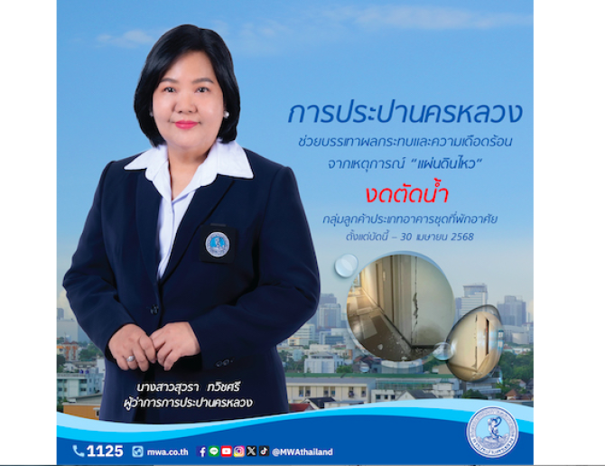 นางสาวสุวรา ทวิชศรี ผู้ว่าการการประปานครหลวง (กปน.) แจ้งว่า ตามที่ กรุงเทพมหานครได้ประกาศเขตพื้นที่ประสบสาธารณภัย จากเหตุการณ์ “แผ่นดินไหว” เมื่อวันที่ 28 มีนาคม 2568 ที่ผ่านมาซึ่งส่งผลกระทบเป็นวงกว้างต่อสิ่งปลูกสร้าง โดยเฉพาะอาคารสูงเป็นจำนวนมาก กปน.มีความห่วงใยและรับทราบถึงผลกระทบอันเกิดขึ้นกับลูกค้าจึงกำหนดแนวทางการบรรเทาความเดือดร้อนของประชาชนในพื้นที่ดังกล่าวด้วยการงดการดำเนินการระงับใช้น้ำ (ตัดน้ำ) ทั้งแบบชั่วคราว (ผูกเคเบิ้ลไทร์) และแบบถาวร (ถอดมาตรวัดน้ำ)ในกลุ่มลูกค้าประเภทอาคารชุดที่พักอาศัย ซึ่งมีที่ตั้งอยู่ในเขตพื้นที่กรุงเทพมหานคร นนทบุรี และสมุทรปราการตั้งแต่บัดนี้ - 30 เมษายน 2568