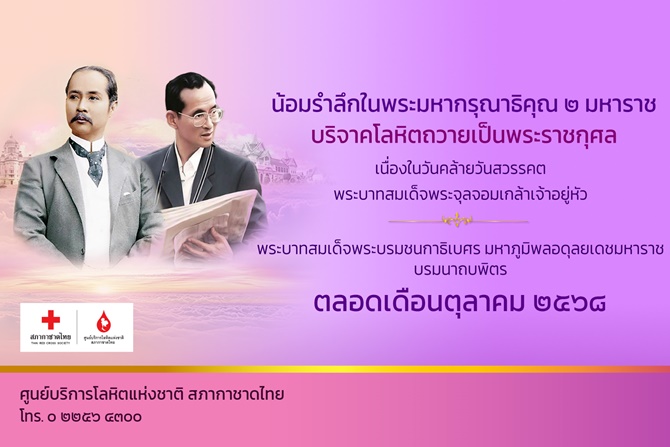 เมื่อวันที่ 2 ตุลาคม 2568 ศูนย์บริการโลหิตแห่งชาติ สภากาชาดไทย เชิญชวนประชาชนทั่วประเทศ ร่วมน้อมรำลึกในพระมหากรุณาธิคุณของพระมหากษัตริย์แห่งราชวงศ์จักรี 2 พระองค์ ได้แก่ พระบาทสมเด็จพระจุลจอมเกล้าเจ้าอยู่หัว รัชกาลที่ 5 เนื่องในวันปิยมหาราช 23 ตุลาคม และพระบาทสมเด็จพระบรมชนกาธิเบศร มหาภูมิพลอดุลยเดชมหาราช บรมนาถบพิตร รัชกาลที่ 9 เนื่องในวันนวมินทรมหาราช 13 ตุลาคม โดยเปิดโอกาสให้พสกนิกรได้ร่วมบริจาคโลหิตถวายเป็นพระราชกุศลตลอดเดือนตุลาคม 2568