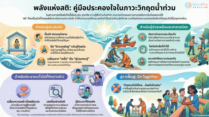นพ.พงศ์เทพ วงศ์วัชรไพบูลย์ ผู้จัดการกองทุนสนับสนุนการสร้างเสริมสุขภาพ (สสส.) กล่าวว่า จากสถานการณ์อุทกภัยที่เกิดขึ้นในพื้นที่ 10 จังหวัดภาคใต้ ก่อให้เกิดผลกระทบความเสียหายทั้งต่อทรัพย์สินและชีวิตประชาชน บางคนต้องสูญเสียคนที่รักและสัตว์เลี้ยง ประชาชนที่ไม่ได้ตั้งรับกับเหตุการณ์อาจมีภาวะเครียดและวิตกกังวลสูง ซึ่งหากมีมากเกินไปจะทำให้สูญเสียความสามารถในการจัดการกับปัญหาที่เกิดขึ้น เพื่อสนับสนุนรัฐบาลในการส่งเสริมให้ประชาชนพร้อมฟื้นฟูสภาพจิตใจ ภายหลังจากเหตุการณ์อุทกภัยกลับเข้าสู่สภาวะปกติ สสส. สานพลัง มูลนิธิสถาบันวิจัยและพัฒนาการเรียนรู้ (สวร.) พัฒนาแนวทางประคองใจในภาวะวิกฤต ภายใต้โครงการจิตวิทยาสติสร้างสุขในองค์กร สู่ Model การสร้างความยั่งยืนในสังคมไทย เดินหน้าส่งเสริมให้ผู้ประสบภัย ผู้ช่วยเหลือ และผู้ติดตามข่าวสาร ใช้หลักการที่เรียกว่า “มีสติ” หรือ “ตั้งสติ” เสริมประสิทธิภาพในการคิด ตัดสินใจ และจัดการกับปัญหาต่างๆ ที่เกิดขึ้น