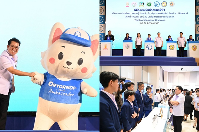 เมื่อวันที่ 24 ธันวาคม 2568 ที่ห้องประชุมชั้น 10 อาคาร OSSC สำนักงานคณะกรรมการอาหารและยา (อย.) นายพัฒนา พร้อมพัฒน์ รัฐมนตรีว่าการกระทรวงสาธารณสุข เป็นประธานแถลงข่าวเปิดตัวกิจกรรม ยุวทูต อย.น้อย (Youth Ambassador Oryornoi) พร้อมเป็นพยานพิธีลงนามบันทึกข้อตกลงความร่วมมือ (MOU) เรื่อง การส่งเสริมความรอบรู้ด้านผลิตภัณฑ์สุขภาพ (Health Product Literacy) เพื่อสร้างยุวทูต อย.น้อย นักสื่อสารผลิตภัณฑ์สุขภาพ ระหว่าง อย. กับสถานศึกษา 4 แห่ง ได้แก่ โรงเรียนเตรียมอุดมศึกษา โรงเรียนสาธิตแห่งมหาวิทยาลัยเกษตรศาสตร์ โรงเรียนเซนต์โยเซฟคอนเวนต์ และโรงเรียนเซนต์คาเบรียล รวมถึงมอบใบประกาศนียบัตรโรงเรียนนำร่องยุวทูต อย.น้อย ในเขตกรุงเทพมหานคร ให้ทั้ง 4 โรงเรียน และสมาคมผู้ปกครองและครูโรงเรียนเตรียมอุดมศึกษา