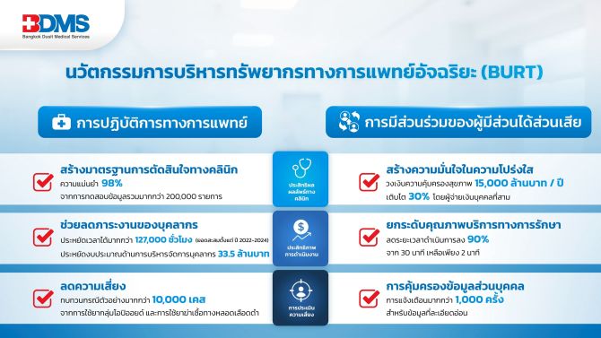 BURT ถือเป็น “ผู้ช่วยอัจฉริยะทางคลินิก” ที่สร้างมาตรฐานใหม่ให้ระบบสุขภาพไทย สามารถทำงานร่วมกับแพทย์ พยาบาล และทีมกำกับมาตรฐานการรักษา ช่วยตรวจสอบความเหมาะสมของแผนการรักษา การวินิจฉัย การใช้ยา ระยะเวลานอนโรงพยาบาล ไปจนถึงการคุ้มครองข้อมูลผู้ป่วย เพื่อยกระดับคุณภาพบริการการรักษา ให้ได้ผลลัพธ์ดีที่สุด ตามความเหมาะสม และความจำเป็น สามารถส่งมอบคุณค่าสูงสุดให้แก่ผู้ป่วย ตามกลยุทธ์ Value-Based Healthcare ของ BDMS