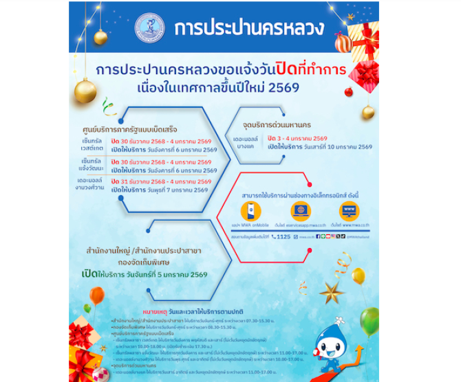 นายกิตติ ศรีพรหมมุนี ผู้อำนวยการฝ่ายสื่อสารองค์กร การประปานครหลวง (กปน.) แจ้งว่า เนื่องในเทศกาลปีใหม่ 2569 กปน. จะปิดให้บริการรับชำระค่าน้ำชั่วคราว ดังนี้