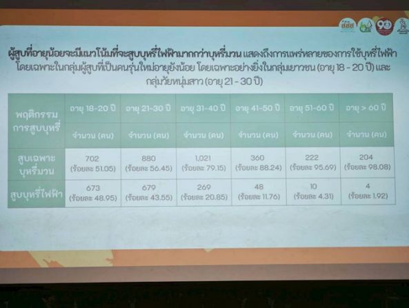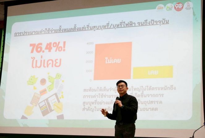 ดร.นพ.ไพโรจน์ เสาน่วม รองผู้จัดการกองทุน สสส. กล่าวว่า ปัจจุบันโครงสร้างตลาดยาสูบเปลี่ยนแปลงไปอย่างรวดเร็วจากการเข้ามาของบุหรี่ไฟฟ้า สสส. ได้สนับสนุนทีมวิจัยคณะเศรษฐศาสตร์ มหาวิทยาลัยธรรมศาสตร์ ศึกษาวิจัยสถานการณ์ค่าใช้จ่ายในการสูบบุหรี่/บุหรี่ไฟฟ้า และพฤติกรรมการสูบ ในพื้นที่ 19 จังหวัด ผลการศึกษาแสดงให้เห็นถึงความท้าทายใหม่ๆ ที่พบว่า บุหรี่ไฟฟ้าเจาะกลุ่มเป้าหมายใหม่ คือกลุ่มเยาวชน 15-20 ปี เป็นผู้สูบถึง 48.95% และผู้หญิง 52.9% สาเหตุหลักที่ทำให้เข้าสู่วงจรการสูบไม่ใช่การติดนิโคติน แต่เป็น "รสชาติและกลิ่น" รวมถึงการมีภาพลักษณ์อุปกรณ์ที่ทันสมัย ขณะที่การซื้อผ่านช่องทางออนไลน์ โดยเฉพาะ LINE และ Facebook เป็นช่องทางหลักที่เยาวชนเข้าถึงบุหรี่ไฟฟ้าได้ง่ายที่สุด นอกจากนี้ ยังมีเรื่องอคติทางพฤติกรรม (Behavioral Bias) ที่ทำให้ผู้สูบไม่ตระหนักถึงภาระทางการเงินและสุขภาพในระยะยาว โดยผู้สูบบุหรี่ไฟฟ้าประเมินอันตรายต่อตนเองต่ำที่สุด ส่วนการสูบบุหรี่มวนยังคงเป็นการสูบที่พบมากที่สุดถึง 66.8% ในจำนวนนี้ สูบเป็นประจำทุกวัน 73% ส่วนใหญ่ซื้อจากร้านขายของชำและร้านสะดวกซื้อ อย่างไรก็ตาม ผู้สูบตระหนักว่าการเลิกสูบจะช่วยประหยัดเงินได้ รวมถึงมองว่าอันตรายจากบุหรี่มวนทั้งต่อตนเองและผู้อื่นสูงกว่าบุหรี่ไฟฟ้า