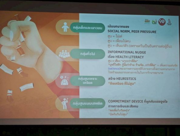 “หัวใจสำคัญของการวิจัยในครั้งนี้คือ การนำแบบจำลองทางเศรษฐมิติ และแนวคิดเศรษฐศาสตร์พฤติกรรม มาช่วยวิเคราะห์ให้เห็นถึงความยืดหยุ่นของรายได้ และแรงจูงใจที่แตกต่างกันในแต่ละกลุ่มประชากร ทั้งเยาวชน ผู้หญิง และกลุ่ม LGBTQIA+ อย่างความนิยมบุหรี่ไฟฟ้าพบว่า กลุ่ม LGBTQIA+ สูบบุหรี่ไฟฟ้ามากกว่าผู้ชาย และประเมินตนเองว่ามีความรู้สูงสุด ยอมรับความเสี่ยงต่อสุขภาพได้มากที่สุด ขณะที่ผู้ชายมีค่าใช้จ่ายบุหรี่/บุหรี่ไฟฟ้าเฉลี่ยต่อเดือนสูงสุด 925.56 บาท กลุ่ม LGBTQIA+ อยู่ที่ 847.70 บาท และผู้หญิงมีค่าใช้จ่ายต่ำสุด 697.09 บาท ข้อมูลเหล่านี้จะเป็นจิ๊กซอว์ชิ้นสำคัญในการออกแบบชุดนโยบายสุขภาพสาธารณะที่เน้นการสะกิดพฤติกรรม (Nudge) เพื่อให้เกิดประสิทธิภาพสูงสุดในการควบคุมยาสูบของไทยต่อไป” ดร.นพ.ไพโรจน์ กล่าว