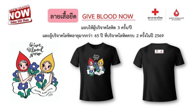 นอกจากนี้ เพื่อเป็นการขอบคุณและสร้างแรงจูงใจ ผู้บริจาคโลหิตที่บริจาคครบ 3 ครั้งต่อปี และผู้บริจาคโลหิตอายุ มากกว่า 65 ปี ที่บริจาคครบ 2 ครั้งในปี 2569 จะได้รับ เสื้อยืด Give Blood Now ลายเส้น Cyrano Design เป็นที่ระลึก