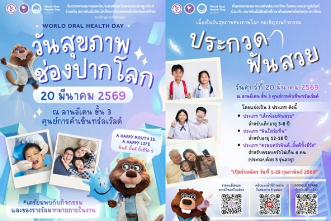 - ทันตแพทยสมาคมฯ ชวนร่วมงาน World Oral Health Day 2026 จัดประกวดสุขภาพฟันดี สนุกกับกิจกรรม และของรางวัลมากมาย 20 มีนาคม นี้ ที่เซ็นทรัลเวิลด์ 19 ก.พ. 2569