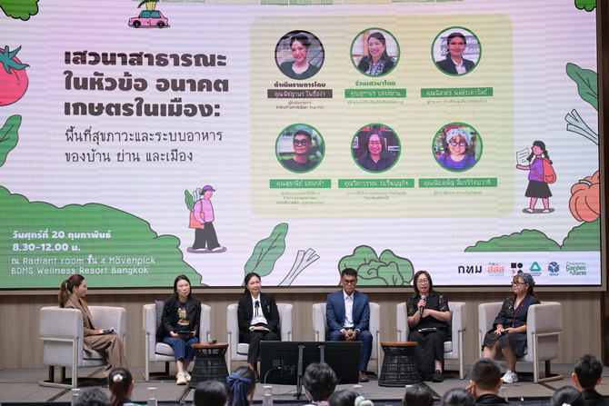วันที่ 20 ก.พ.2569 ที่ Radiant room ชั้น 4 โรงแรม Mövenpick BDMS Wellness Resort Bangkok ศูนย์ออกแบบและพัฒนาเมือง (UDDC-CEUS) คณะสถาปัตยกรรมศาสตร์ จุฬาลงกรณ์มหาวิทยาลัย ร่วมกับ สำนักงานกองทุนสนับสนุนการสร้างเสริมสุขภาพ (สสส.) และกรุงเทพมหานคร จัดงานนำเสนอสาธารณะ “เกษตรในเมือง กินได้-ใกล้บ้าน-ระบบอาหารเมือง ยุทธศาสตร์การเพิ่มพื้นที่สุขภาวะด้วยแนวคิดเกษตรในเมือง” เพื่อนำเสนอผลการดำเนินงานและข้อเสนอเชิงนโยบายในการขับเคลื่อนพื้นที่สุขภาวะด้วยแนวคิดเกษตรในเมืองในกรุงเทพมหานคร
