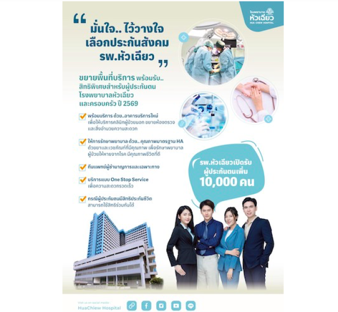 โรงพยาบาลหัวเฉียว เปิดรับผู้ประกันตนในระบบประกันสังคม ประจำปี 2569 เพิ่ม 10,000 ราย เพื่อรองรับความต้องการด้านการรักษาพยาบาลที่เพิ่มขึ้น พร้อมเดินหน้าพัฒนาศักยภาพการให้บริการอย่างต่อเนื่อง ทั้งการขยายพื้นที่คลินิกผู้ป่วยนอก (OPD) และเพิ่มศักยภาพหอผู้ป่วย เพื่อรองรับการให้บริการอย่างเพียงพอ สะดวก รวดเร็ว ลดระยะเวลารอคอย พร้อมดูแลรักษาภายใต้มาตรฐาน HA ด้วยเครื่องมือและเทคโนโลยีทางการแพทย์ที่ทันสมัย ดูแลโดยทีมแพทย์ผู้เชี่ยวชาญเฉพาะทางครบทุกสาขา และบุคลากรทางการแพทย์ที่ผ่านการอบรมเฉพาะด้าน บริการด้วยความใส่ใจในทุกรายละเอียด เพื่อความปลอดภัยและความอุ่นใจของผู้ประกันตน