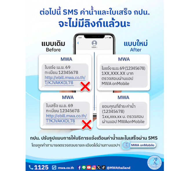 กปน. จะเริ่มปรับเปลี่ยนรูปแบบการส่ง SMS หรือข้อความสั้น ตั้งแต่วันที่ 1 พฤษภาคม 2569 เป็นต้นไปจากเดิมระบุว่า “ใบแจ้ง/ใบเสร็จ เดือน/ปี ทะเบียน xxxxxxxx https://ebill.mwa.co.th/.....” เป็น “ใบแจ้งค่าน้ำ เดือน/ปี (xxxxxxxx) xxxxxx.xx บ. ตรวจสอบผ่านแอป MWA onMobile” หรือ “ขอบคุณที่ชำระค่าน้ำ (xxxxxxxx) xxxxxx.xx บ. ตรวจสอบผ่านแอป MWA onMobile” โดยลูกค้าสามารถตรวจสอบและชำระค่าน้ำประปาด้วยตนเอง ผ่านแอปพลิเคชัน MWA onMobile ได้ตลอดเวลา