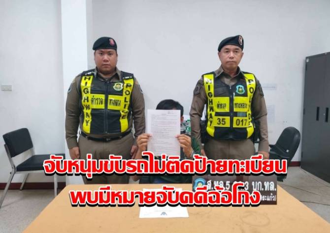 ตร.ทางหลวงปราจีนบุรี เรียกตรวจหนุ่มขับรถไม่ติดป้ายทะเบียน พบมีหมายจับคดีฉ้อโกงหลอกให้เหยื่อโอนเงิน
