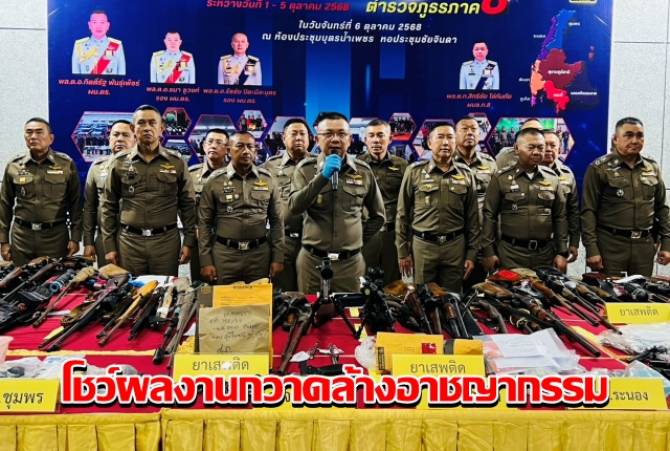ในห้วงเวลาวันที่1ถึง 5 ตุลาคมนี้ตำรวจภูธรภาค8 มอบหมายสั่งการ ให้ตำรวจภูธรจังหวัดในพื้นที่7จังหวัดภาคใต้ตอนบนและกองบังคับการสืบสวนสอบสวนดำเนินการระดมกวาดล้างอาชญากรรมเพื่อปราบปรามจับกุมความผิดเกี่ยวกับอาชญากรรมทางเทคโนโลยีการพนันออนไลน์ยาเสพติดพระราชบัญญัติคนเข้าเมืองอาวุธปืนและวัตถุระเบิดผิดกฎหมายสถานบริการหนี้นอกระบบและบุคคลตามหมายจับ สำหรับความผิดเกี่ยวกับอาวุธปืนวัตถุระเบิดเครื่องกระสุน 336 คดีผู้ต้องหา 332 คนของกลางเป็นอาวุธสงคราม1 กระบอกอาวุธปืนไม่มีทะเบียน 151 กระบอกอาวุธปืนมีทะเบียน71กระบอกวัตถุระเบิด 13 ลูกเครื่องกระสุน 2,413 นัด