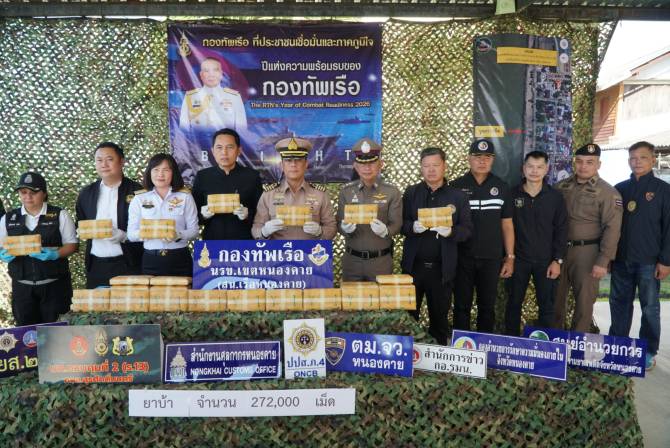 เมื่อเวลา 15.00 น. วันที่ 29 ต.ค.68 ที่สถานีเรือหนองคาย หน่วยเรือรักษาความสงบเรียบร้อยตามลำน้ำโขงเขตหนองคาย นาวาเอกวิศิษฐ์พงศ์ เจริญวิชยเดช ผบ.นรข.เขตหนองคาย,นายไพฑูรย์ มหาชื่นใจ รองผู้ว่าราชการจังหวัดหนองคาย,พ.ต.อ.นวกฤต นวการพาณิชย์ ผกก.สภ.บ้านเดื่อ,นาวาโทอริยะ ทองมั่น หัวหน้าสถานีเรือหนองคาย,นางสาววรรณา ผู้อุตส่าห์ นายด่านศุลกากรหนองคาย, ร.ต.ไชโย หรพูน ผู้แทน บก.ควบคุมที่ 2 กองกำลังสุรศักดิ์มนตรี พร้อมกำลัง นรข. ตำรวจ ฝ่ายปกครอง ศุลกากร ได้ร่วมกัน แถลงข่าวการตรวจยึดยาบ้า จำนวน 272,000 เม็ด