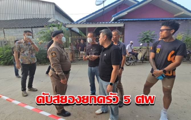 จากการสันนิษฐานเบื้องต้นคาดว่านายสมจินต์น่าจะเป็นผู้ก่อเหตุ ที่เกิดความเครียดในเรื่อง เงินรายได้ ที่ไม่ค่อยดีนัก จึงเกิดความเครียด จนหลายมีอาการหลอน ก่อเหตุทำร้ายคนในครอบครัว โดยใช้ครกหินทุบตีที่ศีรษะทุกคนจนเสียชีวิตก่อน แล้วจึงตัดสินใจผูกคอตนเองเสียชีวิตตายตาม หลังจากนี้เจ้าหน้าที่ตำรวจและเจ้าหน้าที่พิสูจน์หลักฐาน เจ้าหน้าที่แพทย์จากโรงพยาบาลแหลมฉบัง เจ้าหน้าที่ตำรวจชุดสืบสวนสภ. หนองขามได้เข้าตรวจสอบในที่เกิดเหตุและบันทึกภาพไว้เป็นหลักฐานก่อนจะมอบหมายให้เจ้าหน้าที่กู้ภัยสว่างประทีปศรีราชานำร่างผู้เสียชีวิตทั้ง 5 รายส่งชันสูตรหาสาเหตุการเสียชีวิตที่ สถาบันนิติวิทยาศาสตร์โรงพยาบาลตำรวจต่อไป