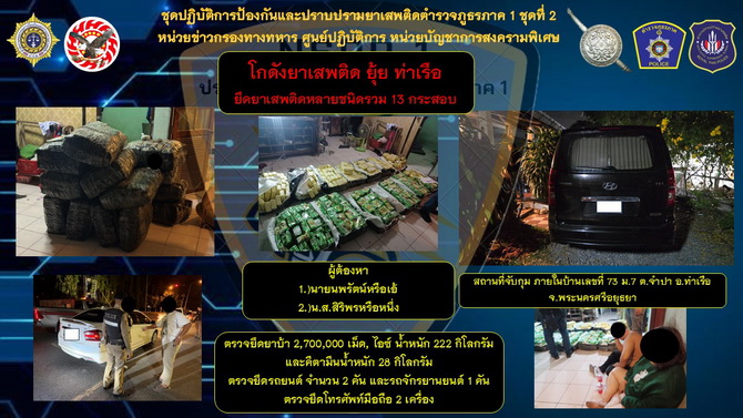 ตำรวจภาค 1 ทลายโกดังยาเสพติด “ยุ้ย ท่าเรือ” ยึดยาบ้ากว่า 2.7 ล้านเม็ด ไอซ์ 222 กก. มูลค่ากว่า 65 ล้านบาท