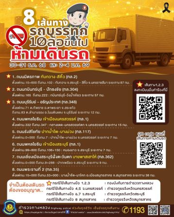 เพื่อเพิ่มความปลอดภัยและลดปัญหาการจราจร พล.ต.อ.สำราญ ระบุว่า ได้มีมาตรการจำกัดการใช้เส้นทางของรถบรรทุกตั้งแต่ 10 ล้อขึ้นไป บนถนนสายหลักในบางช่วงเวลาตามที่กฎหมายกำหนด เว้นแต่รถที่มีความจำเป็น พร้อมขอความร่วมมือประชาชนใช้รถใช้ถนนด้วยความมีน้ำใจ เคารพกฎจราจร และร่วมกันดูแลความปลอดภัย เพื่อให้เทศกาลปีใหม่ 2569 เป็นช่วงเวลาแห่งความสุขและการเดินทางกลับบ้านอย่างปลอดภัยของทุกครอบครัว