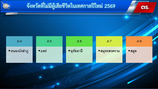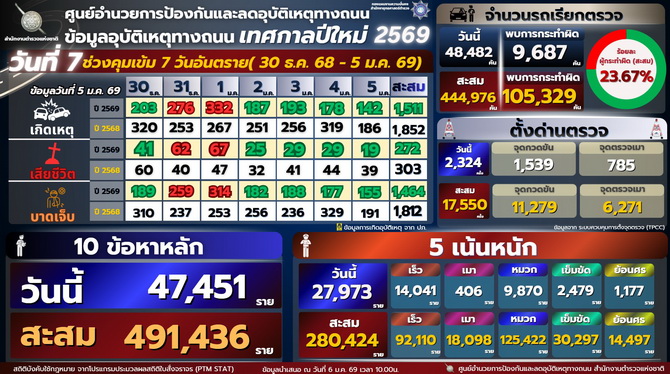 วันที่ 6 มกราคม 2569 - ศูนย์บริหารงานจราจร สำนักงานตำรวจแห่งชาติ (ศจร.ตร.) สรุปผลการดำเนินงานช่วงควบคุมเข้มข้น 7 วันอันตราย เทศกาลปีใหม่ พ.ศ.2569 ระหว่างวันที่ 30 ธันวาคม 2568 – 5 มกราคม 2569 พบว่า ภาพรวมสถานการณ์อุบัติเหตุทางถนนมีแนวโน้ม ลดลงอย่างชัดเจน ทั้งจำนวนอุบัติเหตุ ผู้บาดเจ็บ และผู้เสียชีวิต เมื่อเทียบกับช่วงเดียวกันของเทศกาลปีใหม่ พ.ศ.2568 สะท้อนถึงประสิทธิภาพของมาตรการด้านความปลอดภัยทางถนนและความร่วมมือของประชาชนในการปฏิบัติตามกฎจราจร
