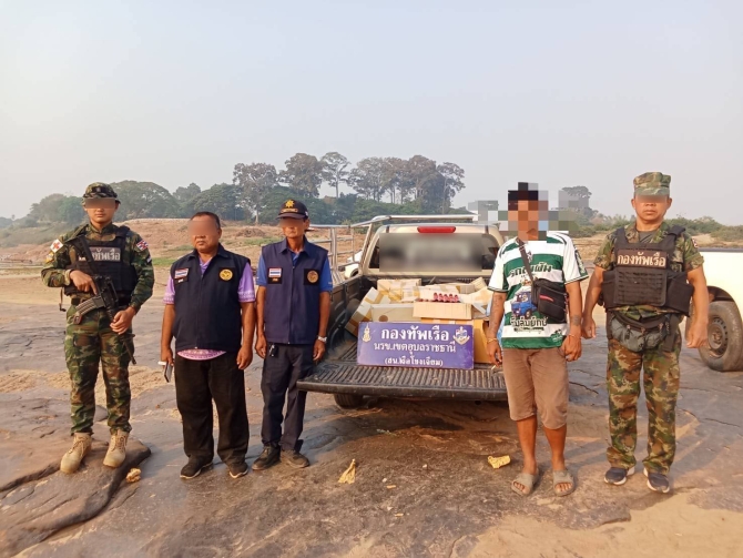 ทั้งนี้ วันที่ 19 มี.ค.69 เวลา 07.00 น.สน.เรือโขงเจียม นรข.อุบลราชธานี โดย น.ท.คัมภีร์ เนื่องจำนงค์ หน.สน.เรือโขงเจียม จัดกำลังพลชุด ทกย.โพธิ์ไทร สน.เรือโขงเจียม ตรวจยึดสินค้าลักลอบนำออกราชอาณาจักรไทยโดยไม่ผ่านพิธีทางศุลกากร และแจ้งข้อกล่าวหา พรบ.ยา พ.ศ.2510 (มาตรา 12) ตรวจยึดยาแก้ไอ ยี่ห้อ ดาทินซิน จำนวน 11 กล่องเล็ก 6 กล่องใหญ่ ประมาณ 2,399 ขวด พร้อมผู้ต้องหาชาย 1 คน (สงวนชื่อ-สกุล) และรถยนต์กระบะ 1 คัน โดยจับกุมตรวจยึดได้ที่ บริเวณริมฝั่งแม่น้ำโขง บ้านสองคอน (ช่องแคบปากบ้อง) ต.สองคอน อ.โพธิ์ไทร จ.อุบลราชธานี