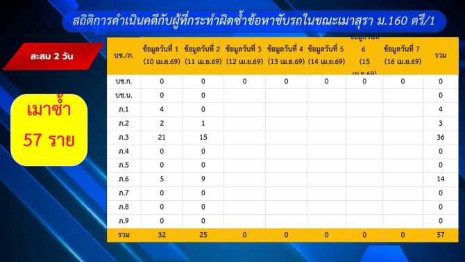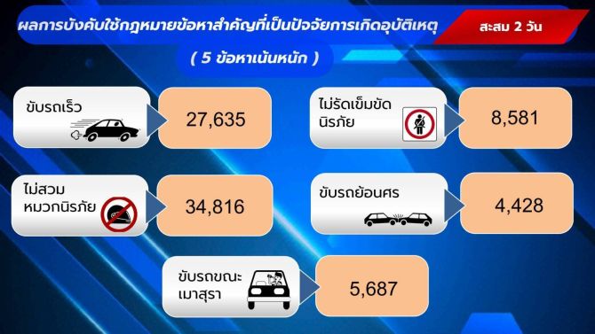 ทั้งนี้ ในช่วง 2 วันของการควบคุมเข้มข้น วันที่ 10-11 เมษายน 2569 ที่ผ่านมา มีการบังคับใช้กฎหมายข้อหาสำคัญที่เป็นปัจจัยการเกิดอุบัติเหตุ โดยเฉพาะข้อหาเน้นหนัก 5 ข้อหา พบว่าข้อหาที่มีผู้กระทำผิดสูงสุดคือ ไม่สวมหมวกนิรภัย 34,816 ครั้ง รองลงมาคือ ขับรถเร็วเกิดกฎหมายกำหนด 27,635 ครั้ง, ไม่คาดเข็มขัดนิรภัย 8,581 ครั้ง, ขับรถขณะเมาสุรา 5,687 ครั้ง ซึ่งตรวจพบเป็นผู้กระทำความผิดซ้ำ จำนวน 57 ราย และขับรถย้อนศร 4,428 ครั้ง สะท้อนให้เห็นถึงความจำเป็นในการร่วมกันลดพฤติกรรมเสี่ยงและเพิ่มความปลอดภัยบนท้องถนนอย่างต่อเนื่องในช่วงเทศกาล