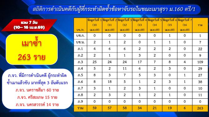 ในส่วนของการบังคับใช้กฎหมายจราจรช่วงควบคุมเข้มข้นทั่วประเทศ ระหว่างวันที่ 10 – 16 เมษายน 2569 พบผู้กระทำผิดใน 10 ข้อหาหลัก รวมทั้งสิ้น 435,387 ราย โดยใน 5 ข้อหาเน้นหนัก ได้แก่ ไม่สวมหมวกนิรภัย 101,706 ราย ขับรถเร็วเกินกฎหมายกำหนด 89,540 ราย ไม่คาดเข็มขัดนิรภัย 24,820 ราย ขับรถขณะเมาสุรา 14,730 ราย (กระทำผิดซ้ำ 263 ราย) และขับรถย้อนศร 13,267 ราย