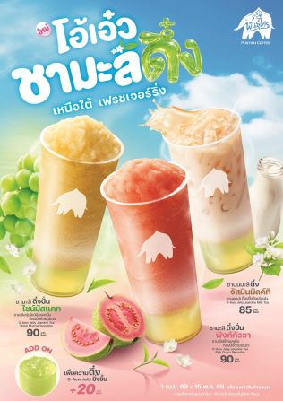 ชามะลิดึ๋งปั่น พิงก์กัววา (90.-) ฝรั่งชมพูสีพาสเทล รสเปรี้ยวอมหวาน ผสานความอร่อย สดชื่นของชามะลิหอมๆ พร้อมโอ้เอ๋วเด้งดึ๋ง เคี้ยวหนุบ ฟินแบบเฟรชๆ