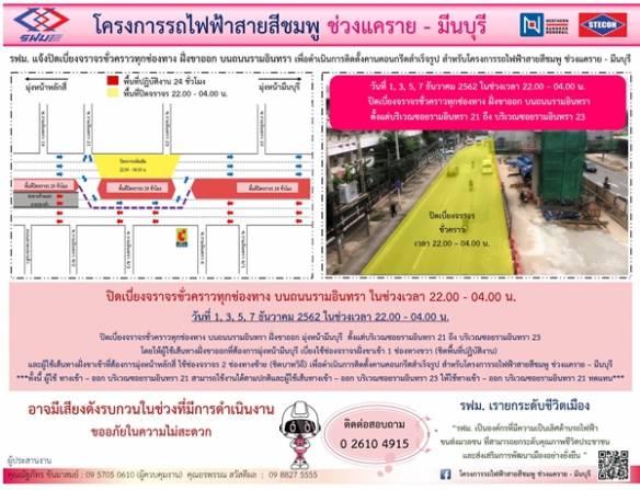 การรถไฟฟ้าขนส่งมวลชนแห่งประเทศไทย (รฟม.) แจ้งว่า บริษัท ซิโน-ไทย เอ็นจีเนียริ่ง แอนด์ คอนสตรัคชั่น จำกัด (มหาชน) ผู้รับจ้างก่อสร้างงานโยธา โครงการรถไฟฟ้าสายสีชมพู ช่วงแคราย - มีนบุรี มีความจำเป็นต้องปิดเบี่ยงจราจรชั่วคราวทุกช่องทาง บนถนนรามอินทรา ฝั่งขาออก ตั้งแต่บริเวณซอยรามอินทรา 21 ถึง บริเวณซอยรามอินทรา 23 เพื่อดำเนินการติดตั้งคานคอนกรีตสำเร็จรูป สำหรับโครงการฯ ในวันที่ 1, 3, 5, 7 ธันวาคม 2562 ในช่วงเวลา 22.00 - 04.00 น. โดยมีรายละเอียด ดังนี้