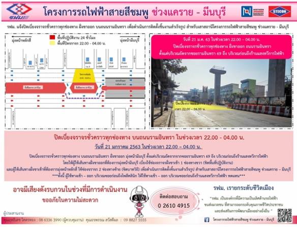 การรถไฟฟ้าขนส่งมวลชนแห่งประเทศไทย (รฟม.) แจ้งว่า บริษัท ซิโน-ไทย เอ็นจีเนียริ่ง แอนด์ คอนสตรัคชั่น จำกัด (มหาชน) ผู้รับจ้างก่อสร้างงานโยธา โครงการรถไฟฟ้าสายสีชมพู ช่วงแคราย - มีนบุรี มีความจำเป็นต้องปิดเบี่ยงจราจรชั่วคราวทุกช่องทาง บนถนนรามอินทรา ฝั่งขาเข้าและฝั่งขาออก ตั้งแต่บริเวณถัดจากซอยรามอินทรา 69 ถึง บริเวณก่อนถึงร้านแสงทวีการไฟฟ้า เพื่อดำเนินการติดตั้งชิ้นงานสำเร็จรูป สำหรับสถานีโครงการฯ วันที่ 21 - 22 มกราคม 2563 ในช่วงเวลา 22.00 - 04.00 น. โดยมีรายละเอียดดังนี้