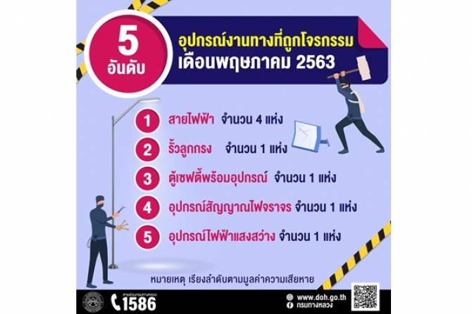 กรมทางหลวง (ทล.) โดยสำนักอำนวยความปลอดภัย ได้รายงานข้อมูลการโจรกรรมอุปกรณ์งานทางของกรมทางหลวง ประจำเดือนพฤษภาคม 2563 ซึ่งอุปกรณ์งานทางได้ถูกโจรกรรมมูลค่าทั้งสิ้น135,320 บาท สำหรับทรัพย์สินที่ถูกโจรกรรมสูงสุด 3 อันดับแรก ได้แก่ สายไฟฟ้า จำนวน 4 แห่ง มูลค่า 47,020 บาท รั้วลูกกรง จำนวน 1 แห่ง มูลค่า 31,600 บาท และตู้เซฟตี้พร้อมอุปกรณ์ จำนวน 1 แห่ง มูลค่า 29,700 บาท เมื่อเปรียบเทียบสถิติกับเดือนพฤษภาคม 2562 พบว่า อุปกรณ์งานทางถูกโจรกรรมลดลงร้อยละ 76 โดยเฉพาะป้ายจราจร สายไฟฟ้า อุปกรณ์ป้ายจราจร อุปกรณ์ไฟฟ้า และอื่นๆ คาดว่าเนื่องจากเป็นช่วงอยู่ระหว่างสถานการณ์โควิด-19 และมาตรการเคอร์ฟิว นอกจากนี้ หากจำแนกตามแขวงทางหลวงพบว่า แขวงทางหลวงพิเศษระหว่างเมืองถูกโจรกรรมอุปกรณ์งานทางมูลค่าสูงสุดในเดือนดังกล่าว รองลงมาคือ แขวงทางหลวงปัตตานี แขวงทางหลวงสมุทรสาคร ตามลำดับ