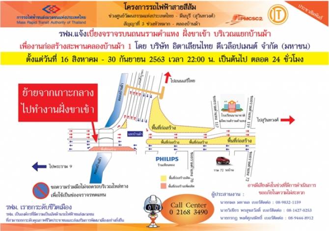 รฟม.เบี่ยงจราจรช่วงแยกบ้านม้า ถ.รามคำแหง 16ส.ค.-30ก.ย.4ทุ่ม24ชม.