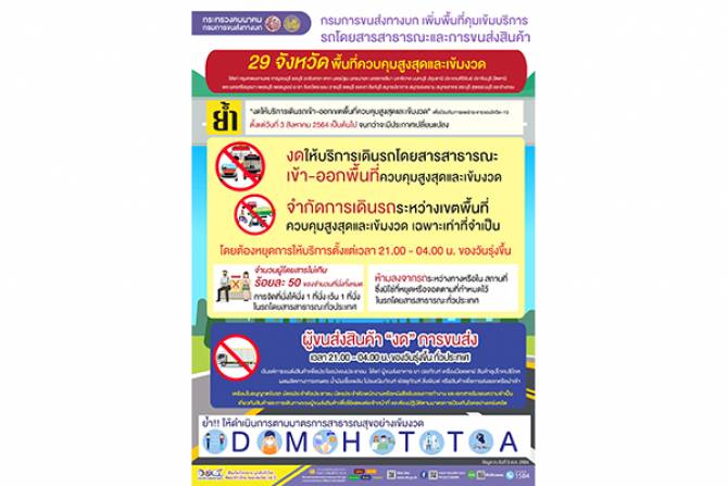 อย่างไรก็ตาม การให้บริการเดินทางด้วยรถโดยสารสาธารณะทุกประเภท ที่มีจุดต้นทางปลายทางจากจังหวัดที่กำหนดเป็นเขตพื้นที่ควบคุมสูงสุดและเข้มงวด “งดให้บริการเดินรถโดยสารประจำทางเข้า-ออกพื้นที่ควบคุมสูงสุดและเข้มงวด” และ “จำกัดการเดินรถระหว่างเขตพื้นที่ควบคุมสูงสุดและเข้มงวด” เฉพาะเท่าที่จำเป็น โดยต้องหยุดการให้บริการตั้งแต่เวลา 21.00 - 04.00 น. ของวันรุ่งขึ้น โดยการให้บริการรถโดยสารสาธารณะภาพรวมทั้งประเทศ ผู้ประกอบการขนส่งต้องดำเนินการตามมาตรการเพื่อควบคุมการแพร่กระจายของโรคอย่างเคร่งครัด อาทิ ต้องมีมาตรการคัดกรองผู้โดยสารตามมาตรการสาธารณสุขอย่างเข้มงวด กำหนดจำนวนผู้โดยสารไม่เกินร้อยละ 50 ของจำนวนที่นั่งทั้งหมด และต้องปฏิบัติตามทางมาตรการเว้นระยะห่าง จัดที่นั่งของรถโดยสารประจำทางและรถโดยสารไม่ประจำทาง ให้จัดที่นั่ง 1 ที่นั่ง เว้น 1 ที่นั่ง โดยต้องบริหารจัดการให้จำนวนรถและเที่ยววิ่งเพียงพอต่อความจำเป็นและตามเวลาที่เหมาะสมกับการเดินทางของประชาชน โดยในระหว่างการให้บริการห้ามลงจากรถระหว่างทางหรือในสถานที่ซึ่งไม่ใช่ที่หยุดหรือจอดตามที่กำหนดไว้ เพื่อให้สามารถตรวจคัดกรองผู้โดยสารตามมาตรการสาธารณสุขได้อย่างเต็มประสิทธิภาพ