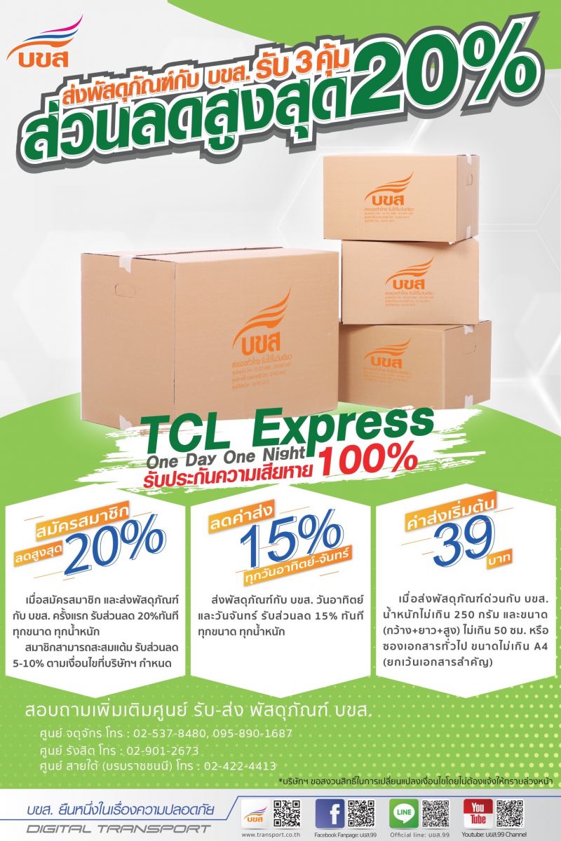 ทั้งนี้ เพื่อพัฒนาการบริการรับส่งพัสดุภัณฑ์ และเพิ่มทางเลือกให้กับผู้ใช้บริการ บขส.ได้จัดโปรโมชั่นพิเศษ ดังนี้ 1.มอบส่วนลดค่าบริการ 20% ให้กับลูกค้าที่สมัครสมาชิกใหม่และเพิ่มความคุ้มด้วยการสะสมยอดรับส่วนสดสูงสุดถึง 10% 2. เมื่อส่งพัสดุภัณฑ์ด่วน (ตามขนาดที่กำหนด) ราคาเริ่มต้นที่ 39 บาท และ 3.ส่งพัสดุภัณฑ์ทุกวันอาทิตย์และวันจันทร์ รับส่วนลดค่าบริการ 15% เริ่มตั้งแต่วันนี้เป็นต้นไป เงื่อนไขเป็นไปตามที่บริษัทฯ กำหนด สอบถามรายละเอียดเพิ่มเติมได้ที่, ศูนย์รับ-ส่ง พัสดุภัณฑ์ (จตุจักร) โทร 02-537-8480, ศูนย์รับ-ส่ง พัสดุภัณฑ์ (รังสิต) โทร 02-901-2673, ศูนย์รับ-ส่ง พัสดุภัณฑ์ สายใต้ (บรมราชชนนี) โทร 02-422-4413