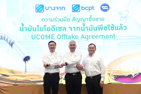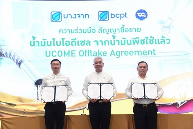 นายปฏิวัติ ทิวะศะศิธร์ รองกรรมการผู้จัดการใหญ่ กลุ่มธุรกิจโรงกลั่นและค้าน้ำมั น และประธานเจ้าหน้าที่ปฏิบัติ การ-โรงกลั่น บริษัท บางจาก คอร์ปอเรชั่น จำกัด (มหาชน) นายบัณฑิต หรรษาไพบูลย์ ผู้ช่วยกรรมการผู้จัดการใหญ่ บริษัท บางจาก คอร์ปอเรชั่น จำกัด (มหาชน) ในฐานะกรรมการบริษัท BCP Trading จำกัด หรือ BCPT และ นายธนวัฒน์ ลินจงสุบงกช กรรมการผู้จัดการ บริษัท ธนโชค ออยล์ ไลท์ จำกัด ร่วมลงนามในสัญญาซื้อขายน้ำมั นไบโอดีเซลจากน้ำมันพืชใช้แล้ว (Used Cooking Oil Methyl Ester หรือUCOME) โดยบางจากฯ เป็นผู้มีสิทธิ์รับซื้อรายเดี ยวในประเทศไทย ด้วยปริมาณซื้อขายกว่า 5 ล้านลิตรต่อเดือน ดำเนินงานผ่านบริษัท BCPT กิจการค้าน้ำมันในกลุ่มบางจากฯ ซึ่งปัจจุบันเป็นผู้ค้าน้ำมันอิ สระอันดับหนึ่งในตลาดสิงคโปร์ ในการวางแผนจัดจำหน่ายน้ำมั นไบโอดีเซลจากน้ำมันพืชใช้แล้ วสำหรับใช้ทั้งในและต่างประเทศ