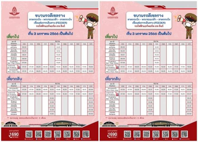 สำหรับผู้โดยสารที่มีความประสงค์จะเดินทางโดยรถดีเซลรางชานเมือง (Feeder) สามารถตรวจสอบเส้นทางและสอบถามรายละเอียดเพิ่มเติม ได้ที่ศูนย์บริการลูกค้าสัมพันธ์ หมายเลขโทรศัพท์ 1690 ตลอด 24 ชั่วโมง หรือเฟซบุ๊ก แฟนเพจ ทีมพีอาร์การรถไฟแห่งประเทศไทย